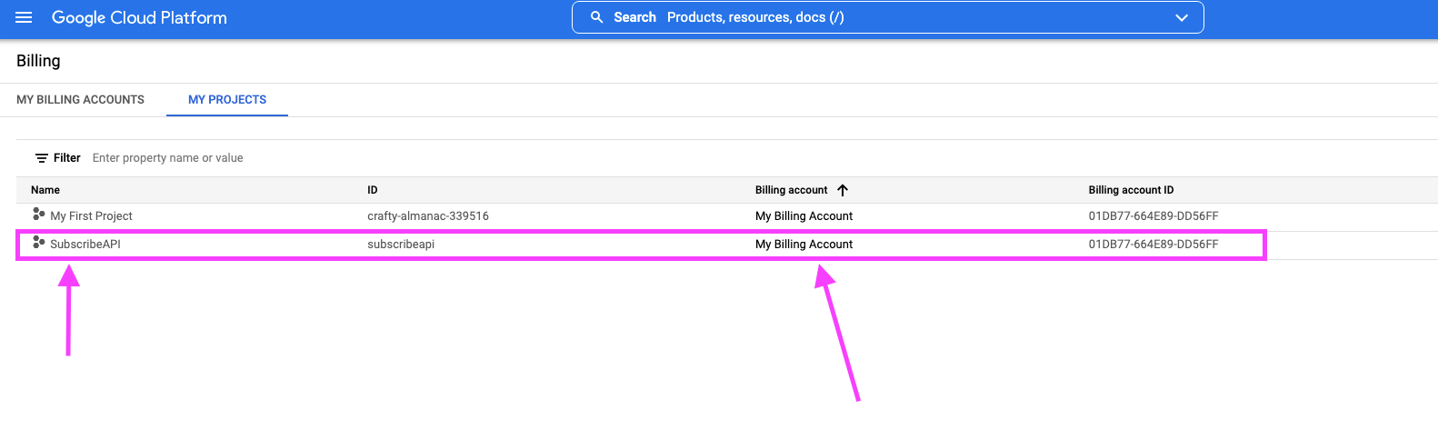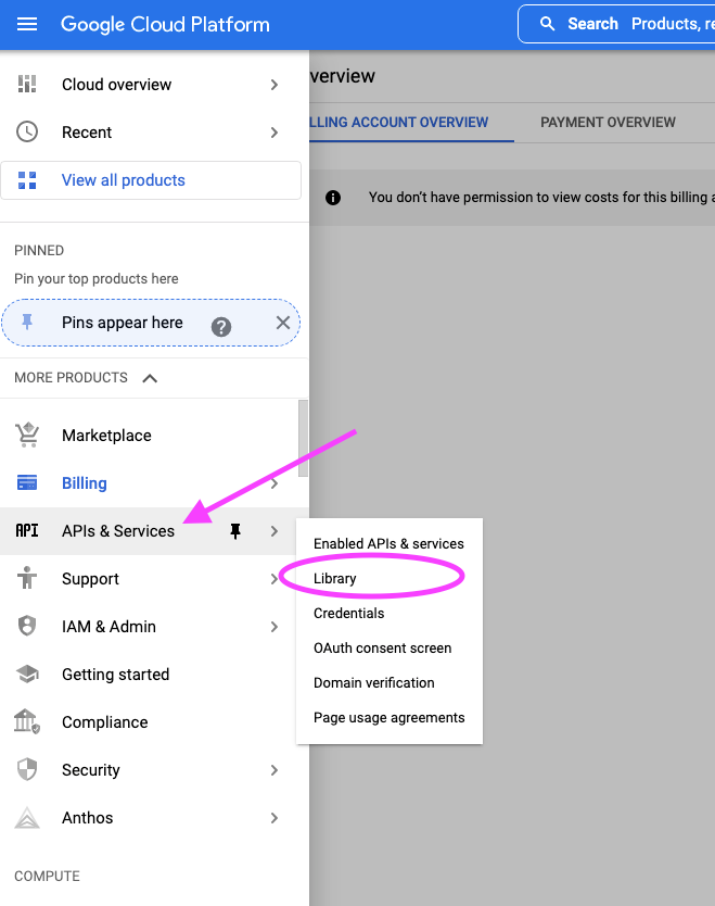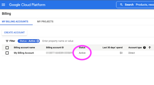 - Confirm active billing is setup by clicking "Billing" in the navigation menu (https://console.cloud.google.com/billing).